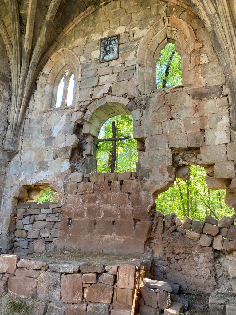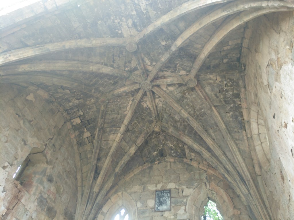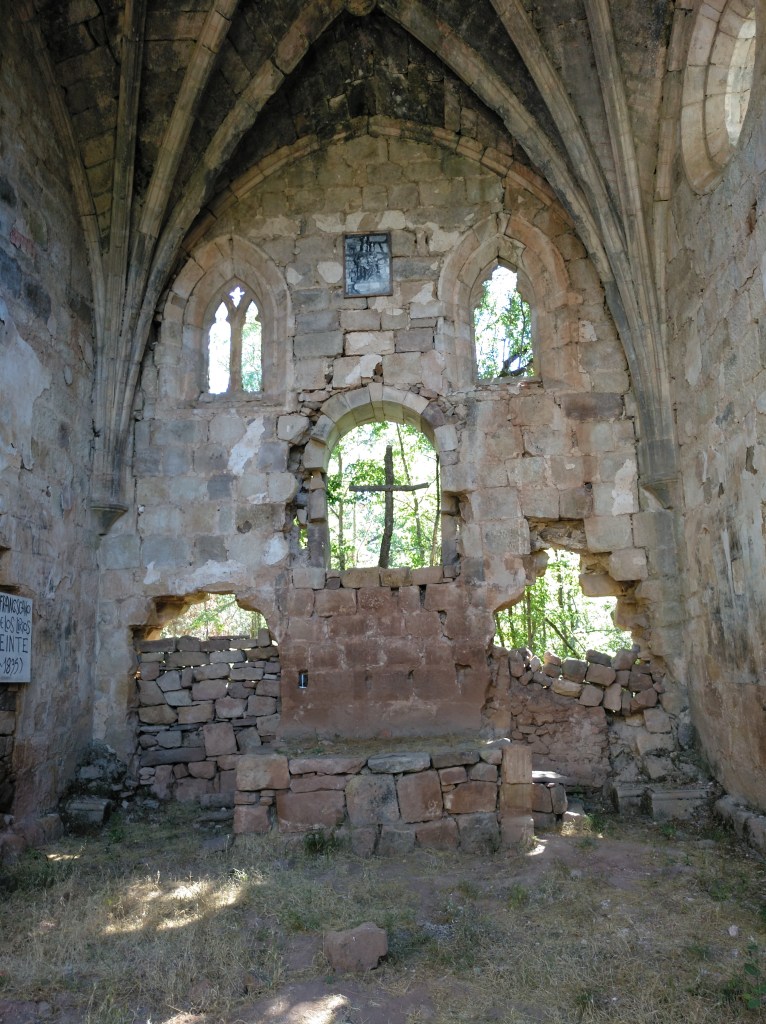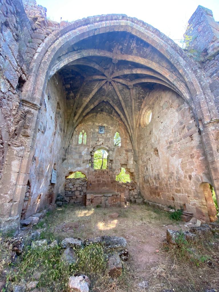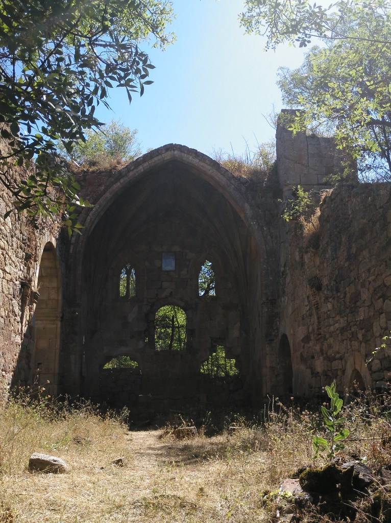 Podemos acceder a las ruinas por un sendero-arroyo que arranca en la parte derecha del camino. Lo hemos señalizado con un waypoint, pero lo más recomendable es seguir hasta un prado vallado, saltar la pared de piedra que rodea el portón y cruzarlo hasta el final. Salimos del prado y bordeando la pared por fuera, a unos 100 metros habremos llegado al Monasterio.