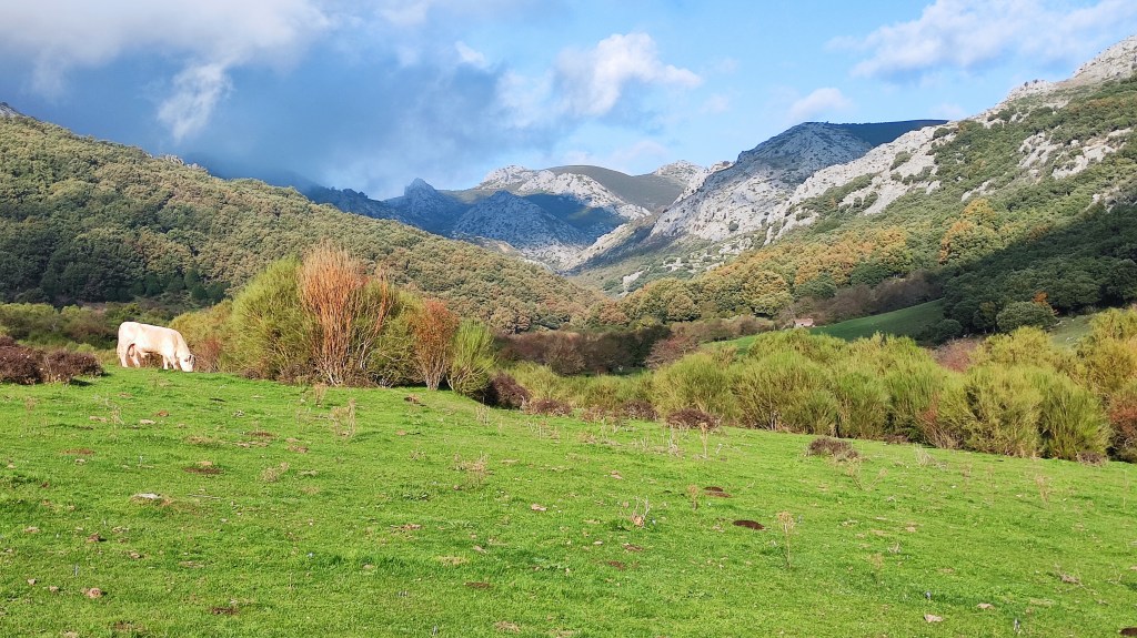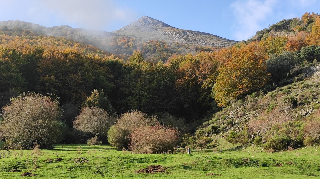 Precioso balcón natural, bien habilitado, con magníficas vistas del Pico del Roblillo enfrente, y de varias cumbres de la Montaña Palentina al fondo.