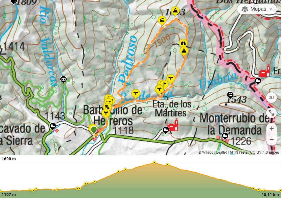 Salimos de la Plaza Mayor de Barbadillo de Herreros por la carretera BU-825 en dirección a Monterrubio de la Demanda. Al final del pueblo y sin cruzar el puente del río Pedroso, nos vamos a la izquierda por la C/ Santiuste. Entramos en la Ferrería, primero, y , después, buscamos el Camino del Chorranco al otro lado de un abandonado ferrocarril, convertido, en 2003, en un excelente camino natural ecológico. Avanzamos junto al río y no cruzamos el puente de madera. Continuamos por el margen izquierdo del río, junto a un precioso bosque de hayas y robles musgosos, frecuentemente adornados con un precioso musgo, hasta el arroyo del Chacarro y la Cascada del Chorranco (km 4,2). En épocas de lluvia y hielo, solemos encontrar una hermosa chorrera con algunos carámbanos en los laterales. El lugar, cuando hay mucho agua, invita a disfrutar del suave ruido y de las elegantes formas que va formando el salto de agua. Volvemos a la orilla del río Umbría, cruzamos el arroyo del Chacarro y cogemos, a la izquierda, una estrecha y escondida senda que arranca justo al otro lado del arroyo. Por esta vereda, a veces tapada y obstruida por las ramas de los matojos, ascendemos una dura y empinadísima cuesta, de casi el 30% de desnivel, hasta un balcón natural, próximo a la Tenada de Urdiales, desde donde tenemos una magnífica vista del barranco y del hayedo de la Umbría. Tomamos, después, un amplio camino rodado que nos sube hasta el Camino de Urdiales. Seguimos por la derecha para recorrer apenas 200 metros e irnos por la izquierda por otra pista forestal, escoltada por preciosos y centenarios robles rebollos, la cual, tras pasar por el Cerro de Camorro y cruzar el Camino de la Demanda, corona en el punto más alto de la ruta: Pico o Cerro dos Hombres (km 8,3) . Nos perdemos en identificar con nuestro «pickfinder» las múltiples cumbres que se divisan desde el gran hito y refugio de piedras que preside la cima.