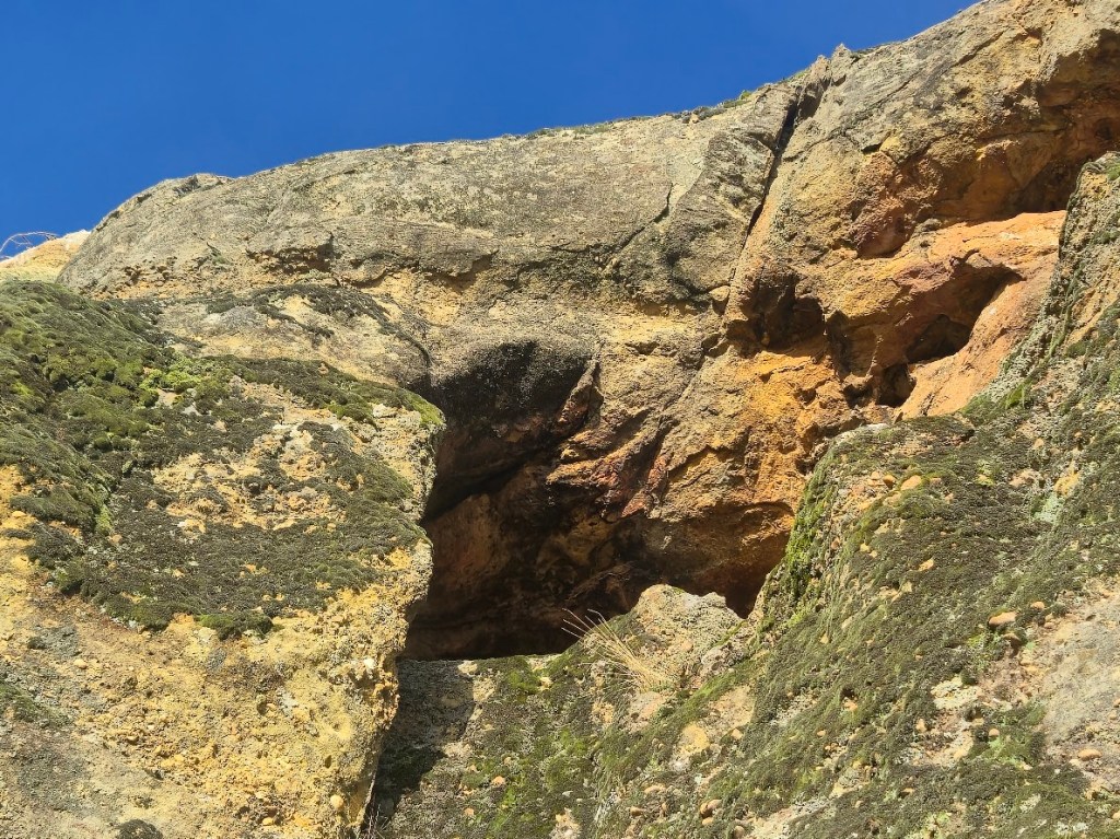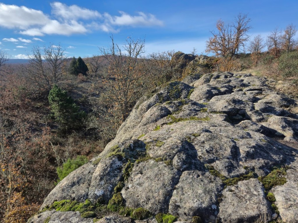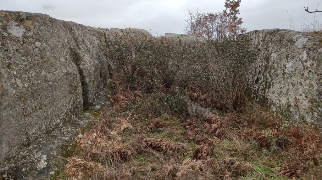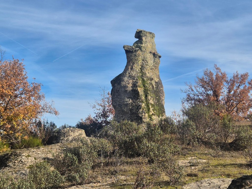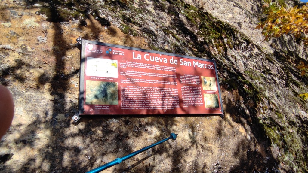 Volvemos al camino principal y hacemos una breve parada en la «Peñita el vino», emulando a antiguos pastores del lugar que se reunían aquí para hacer el avituallamiento juntos y , también, para dirimir sus desencuentros y diferencias en el reparto de pastos. Pronto cruzamos una cancela, lo que nos indica que dejamos Ledanías y entramos en terreno de Hacinas, y ascendemos hasta una amplia roca a nivel del suelo, curiosamente denominada «Tenada Quemada», en la que es interesante observar inscripciones y dibujos grabados por los pastores en las rocas. Un poco más adelante, desvío hacia la izquierda para visitar Las Trisineras (km 6,1), yacimiento donde, en el año 1976, fue destapado el árbol fósil número 1 que está delante del museo. El ejemplar número 2, que vemos tumbado en un rincón en la subida a la iglesia del pueblo, fue encontrado en Vallejo la Zarza, lugar no visitado en este recorrido. Vuelta a la senda principal para acercamos a la Peña San Marcos. Accedemos a ella por una puerta principal de entrada, señalizada con una tablilla de madera labrada, y subimos al balcón natural para contemplar una gran masa forestal y bellísimas vistas de la parte que mira hacia Cabezón. En la Peña San Marcos hallamos la la cueva (km 6,9), un buen molde de árbol fósil colgado a 6 m de altura, y algunos moldes más pequeños pegados al suelo. Se cree que la cueva pudo ser habitada por eremitas.