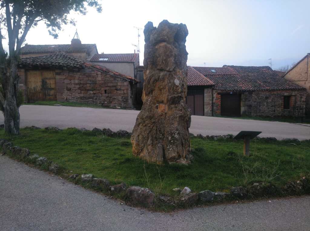 Procedentes de coníferas sepultadas en la Era Secundaria o Mesozoica y con una antiguedad de 120 millones de años, los árboles fósiles que hoy se exponen fueron descubiertos por los pastores locales y desenterrados en los años noventa del siglo pasado. Hay 7 ejemplares localizados, de los cuales 3 han sido trasladados al municipio. El más importante está en la plaza, junto al Centro de Interpretación. De unos 6 m de longitud, se han izado 3.20 m, permaneciendo los tres trozos restantes tumbados en el suelo. Fue encontrado en el paraje de Las Trisineras, lugar que visitamos en esta ruta. El segundo, es un ejemplar completo de unos 5 m. Lo podemos ver tumbado y protegido por un tejado a la izquierda de la calzada que sube a la iglesia. Fue encontrado en Vallejo la Zarza, lugar no visitado en este recorrido. El tercero, colocado a la entrada del pueblo, es una reconstrucción de varios trozos de un árbol petrificado. Hay un cuarto árbol encastrado en la falda del castillo que mira al cementerio. En la cara norte del castillo, hay una cueva, la de los Moros, que también es considerada un molde de árbol fósil.