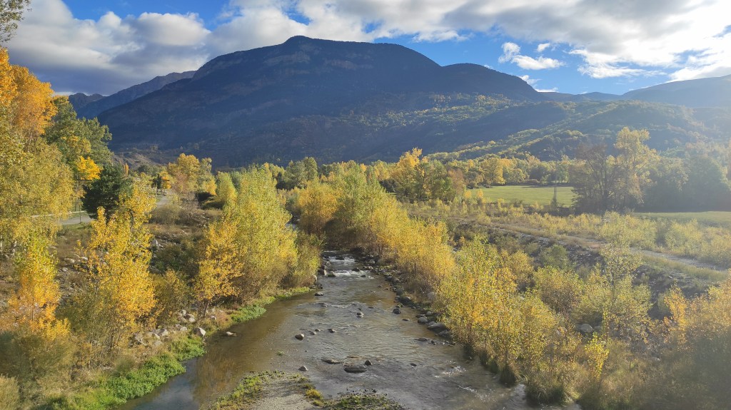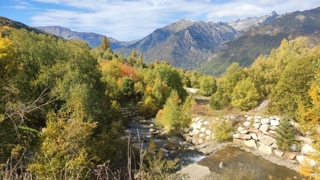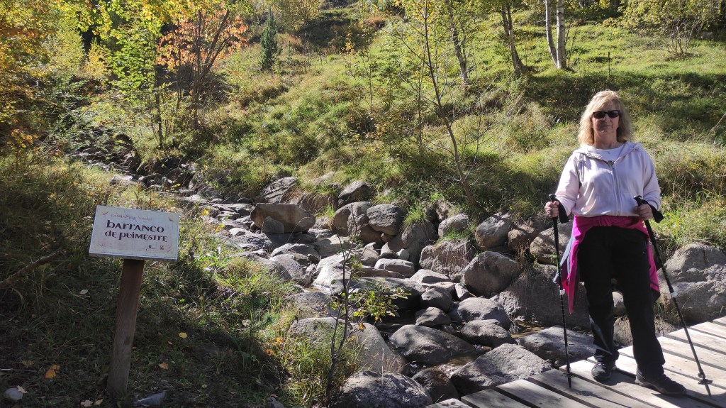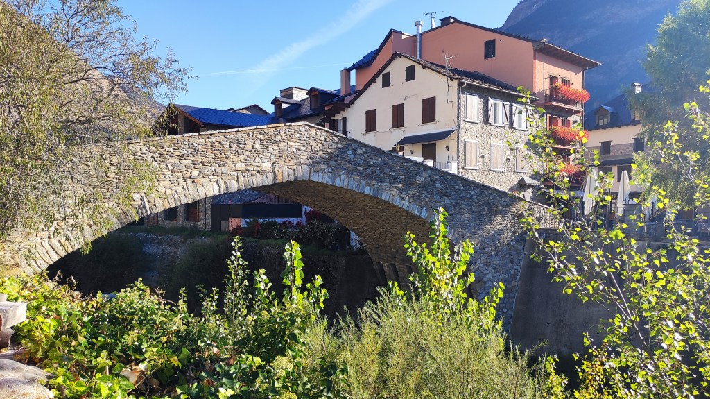 Salimos del puente medieval, junto al río Ésera, en dirección este. Pasamos por un área de picnic, que dejamos a la derecha, y al llegar al puente del Ésera, lo cruzamos para pasar al otro margen del río. En lugar de continuar por la carretera de Anciles, tomamos, muy cerquita, un bonito sendero que, saliendo desde la derecha, nos llevará hasta la Plaza de San Gregorio, a través de la Calle Barranco d´Alto, a las puertas de Anciles. El recorrido continua por la PR-HU 33, que encontramos nada más entrar al pueblo, pero nos adentramos en la aldea para visitar la iglesia y la calle del General Ferraz, con su Casa Piñana y otras construcciones típicas en piedra como la Casa Barrau. Regresamos a la Plaza Escuy y, por la derecha, nos vamos hacia Cerler por un camino empedrado que arranca desde el pueblo y pasa por el cementerio. Empezamos a subir por una hermosa vereda, flanqueada por tapias de piedra que cercan viejos prados. Pasamos por varios barrancos: la Selba, Puimestre y Remáscaro.
