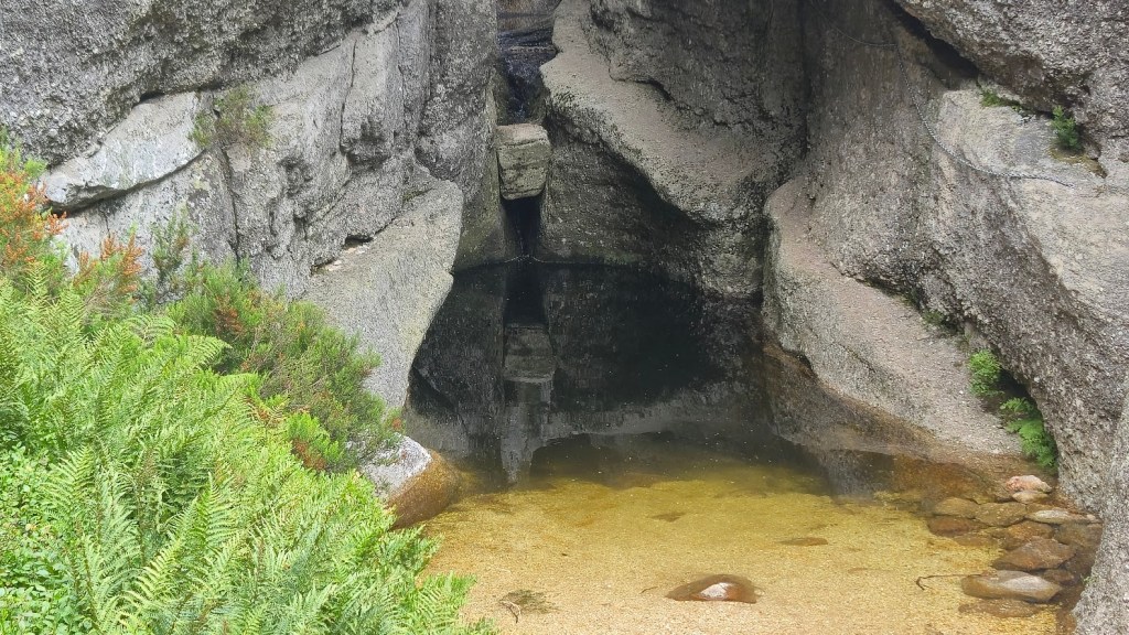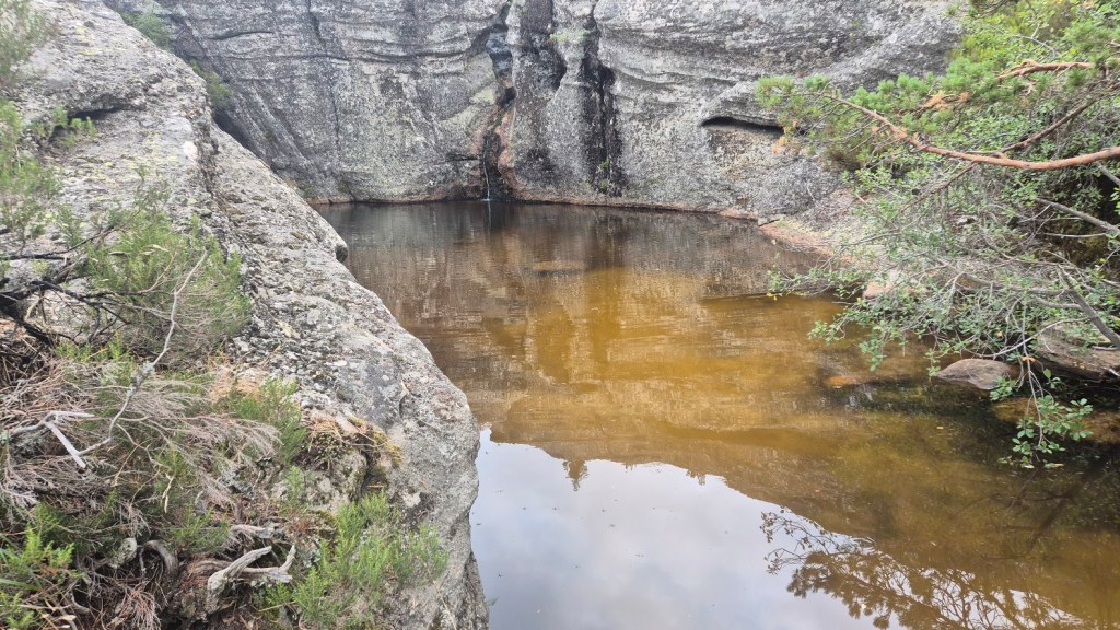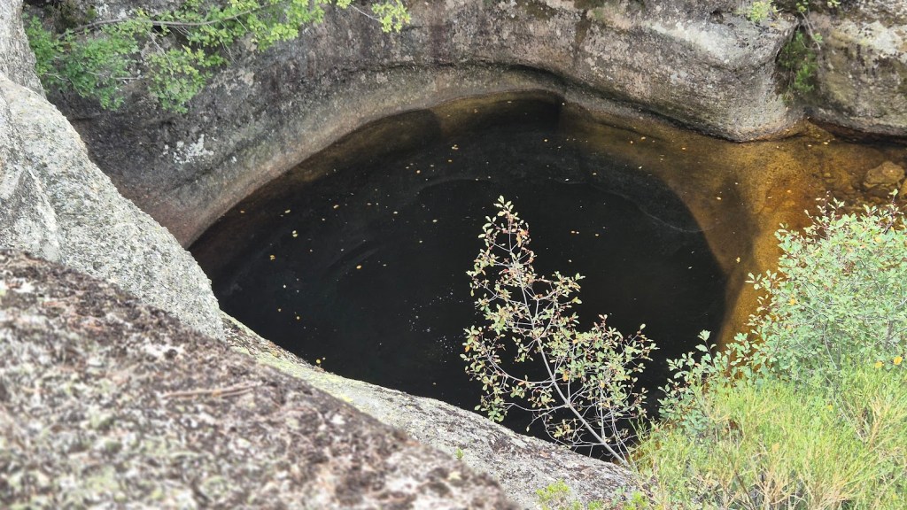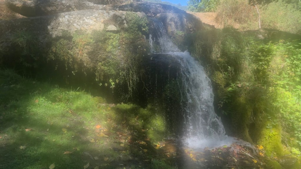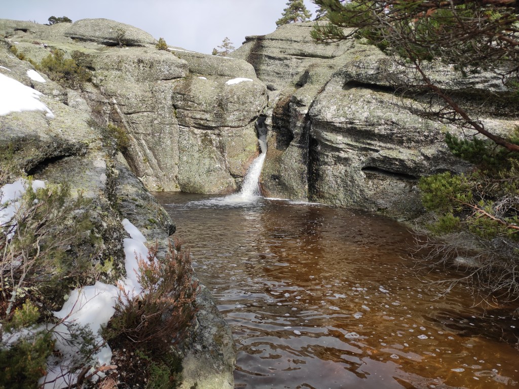El lugar es único y de tal belleza que cuesta abandonarlo. Lo hacemos dirigiéndonos al camino forestal de Cargaduelo para continuar nuestra ruta por la derecha. Bajamos unos ochocientos metros y nos vamos en búsqueda de una angosta y escondida senda que nos da acceso a las calderas de Matalhierro. Encontramos la vereda a la parte derecha, unos pocos metros antes de llegar a un puente sobre el arroyo Valladares. La seguimos con cuidado, ya que, en algunos sitios, no es muy visible. Muy pronto encontramos la primera hoya. La cascada , que en otras épocas del año suele mostrarse silenciosa y con escasa agua, suelta un bello, inmenso y sonoro chorro de agua.