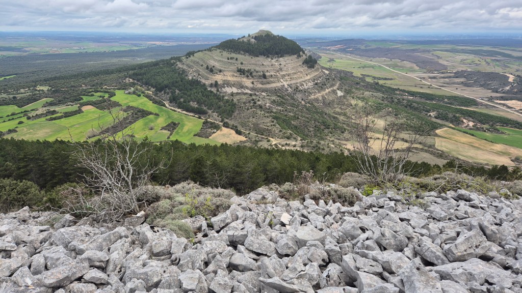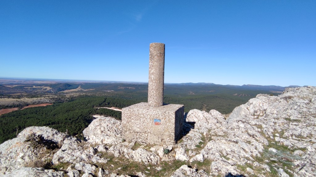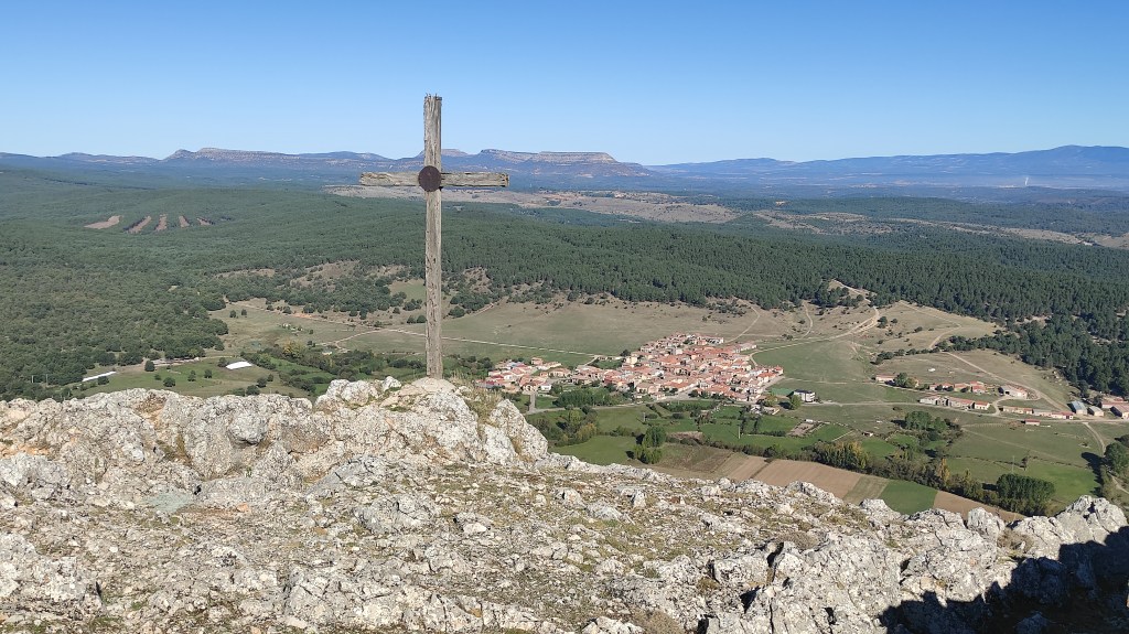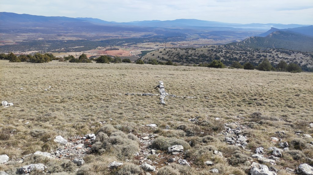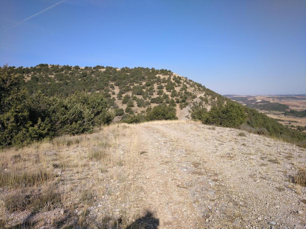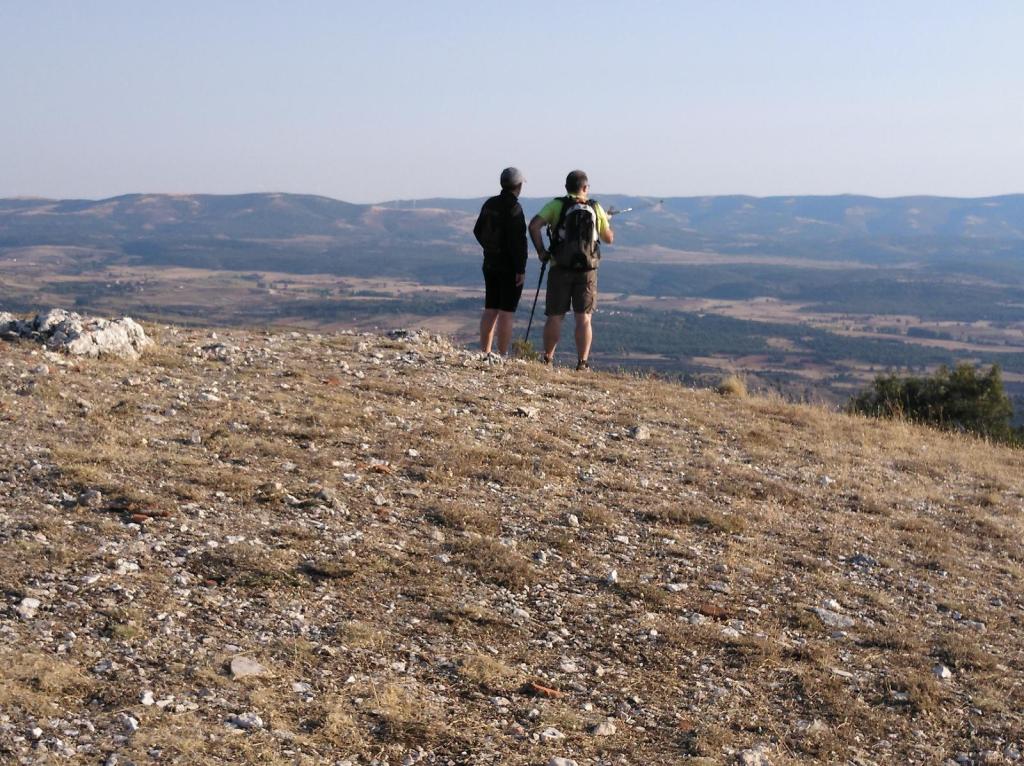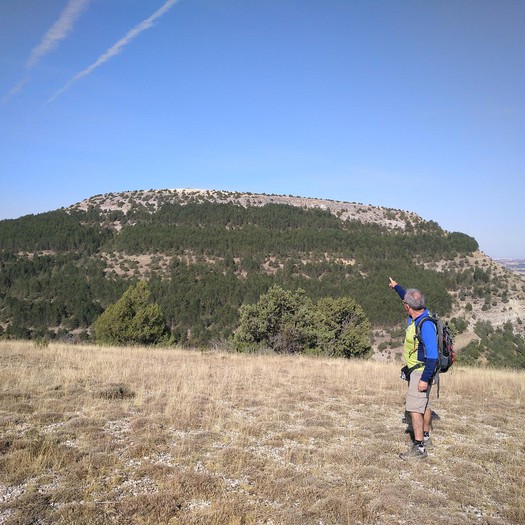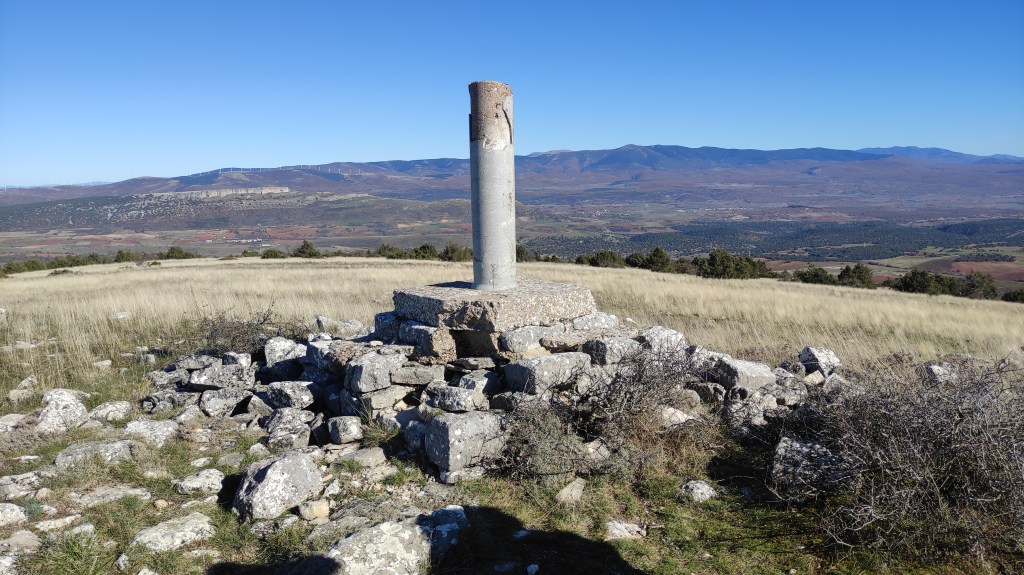 Tras disfrutar, un buen rato, del impresionante paisaje, volvemos a la ermita por la misma vereda. Pasamos por delante de su puerta principal y, por el este, tomando un camino forestal, nos dirigimos al Collado de la Muela. A partir de este punto, no hay camino marcado; sólo unos pocos hitos desperdigados y la vista de la meseta de la muela nos guían hasta su cima. La subida es campo a través, cruzando un bosque de pinos donde tenemos la sensación de caminar sin rumbo. Ya casi arriba, buscamos un estrecho canal que nos ayuda a salvar el pequeño acantilado. Llegados a la meseta, avanzamos por la derecha en dirección a la cresta. Podemos adivinar los restos de la antigua muralla de un castro celtibérico que cubría toda la llanura, y fotografiar un precioso mojón de piedras, cuya utilidad desconocemos, que nos queda a la derecha junto al acantilado. En la cima de la muela, un pequeño refugio de piedras, un vértice geodésico, una cruz de piedras en el suelo y, lo más llamativo de todo, unas vistas aún más deslumbrantes que las del Castillejo, ya que, a las anteriores, se suman, al este, la Sierra de Gayubar y la Sierra de la Demanda con la Campiña como pico más destacado.