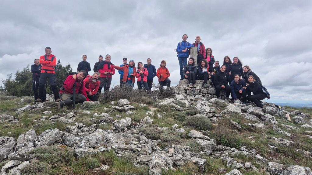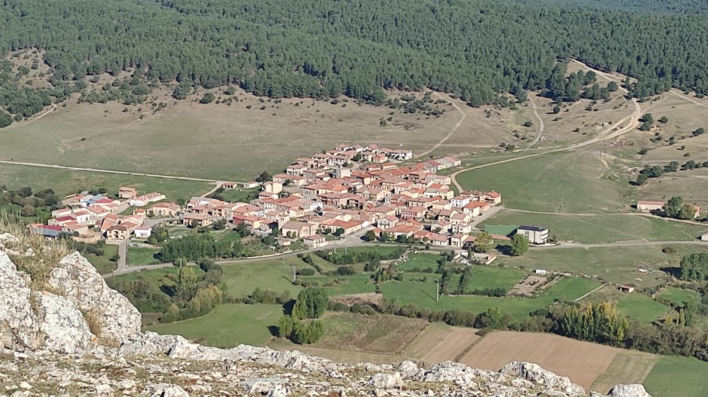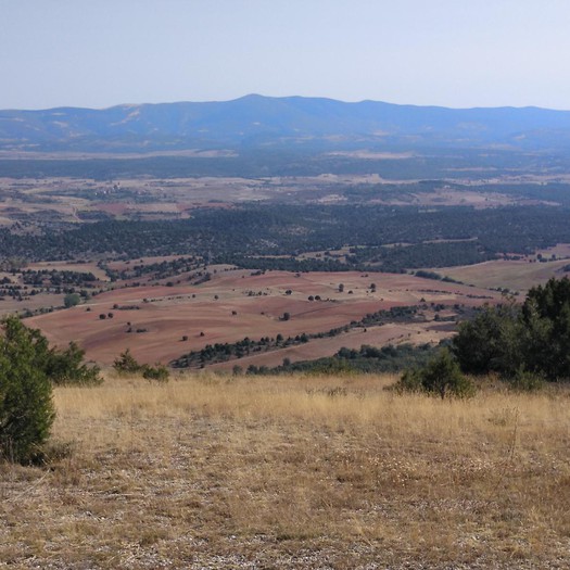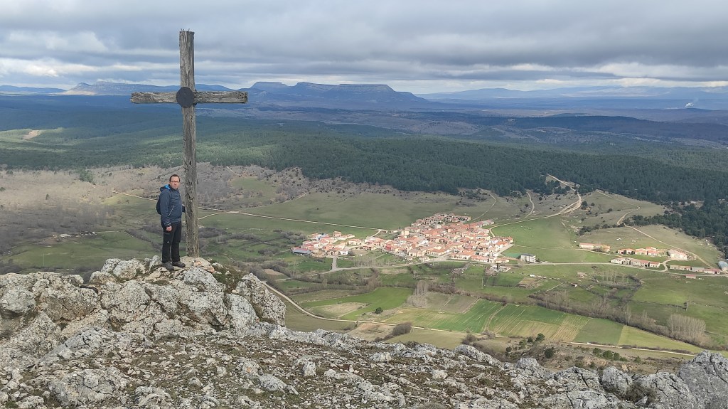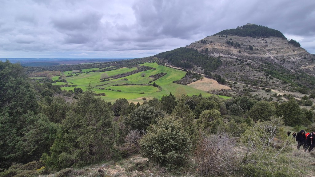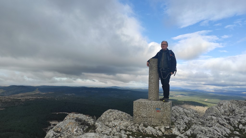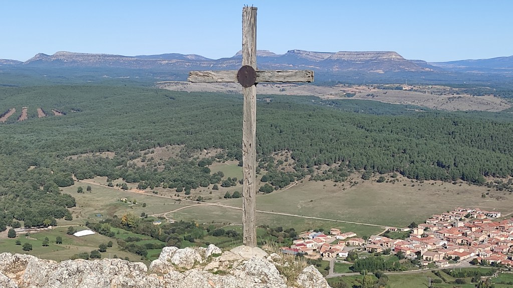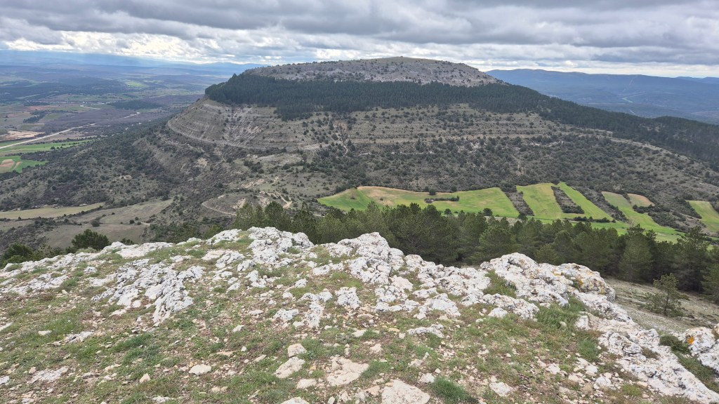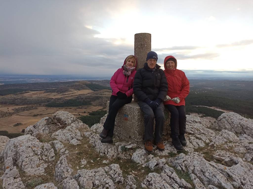 Tras disfrutar, un buen rato, del impresionante paisaje, volvemos a la ermita por la misma vereda. Pasamos por delante de su puerta principal y, por el este, tomando un camino forestal, nos dirigimos al Collado de la Muela. A partir de este punto, no hay camino marcado; sólo unos pocos hitos desperdigados y la vista de la meseta de la muela nos guían hasta su cima. La subida es campo a través, cruzando un bosque de pinos donde tenemos la sensación de caminar sin rumbo. Ya casi arriba, buscamos un estrecho canal que nos ayuda a salvar el pequeño acantilado. Llegados a la meseta, avanzamos por la derecha en dirección a la cresta. Podemos adivinar los restos de la antigua muralla de un castro celtibérico que cubría toda la llanura, y fotografiar un precioso mojón de piedras, cuya utilidad desconocemos, que nos queda a la derecha junto al acantilado. En la cima de la muela, un pequeño refugio de piedras, un vértice geodésico, una cruz de piedras en el suelo y, lo más llamativo de todo, unas vistas aún más deslumbrantes que las del Castillejo, ya que, a las anteriores, se suman, al este, la Sierra de Gayubar y la Sierra de la Demanda con la Campiña como pico más destacado.