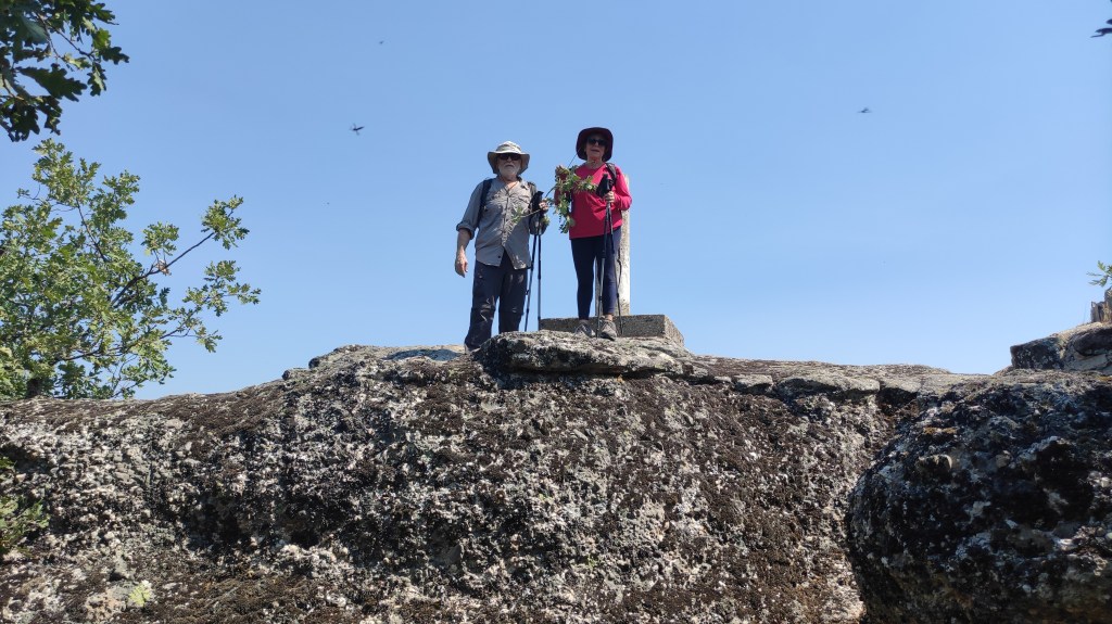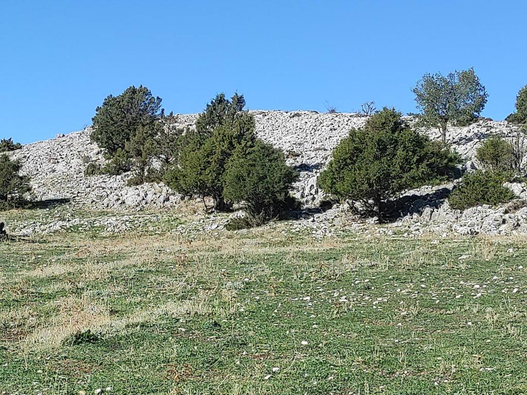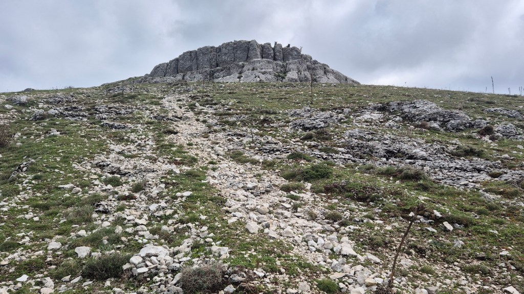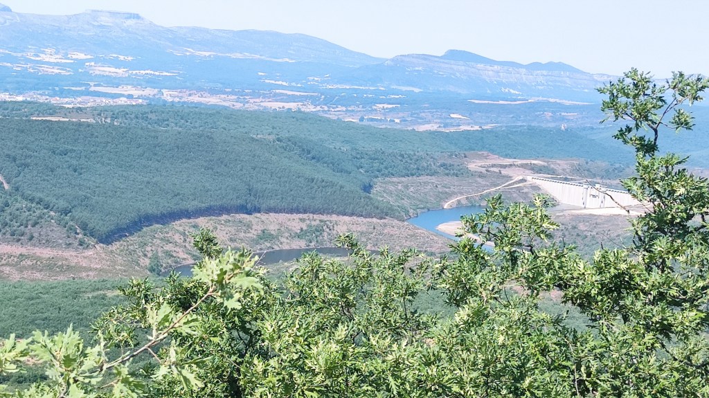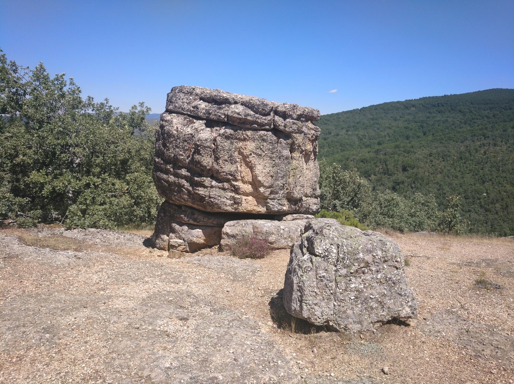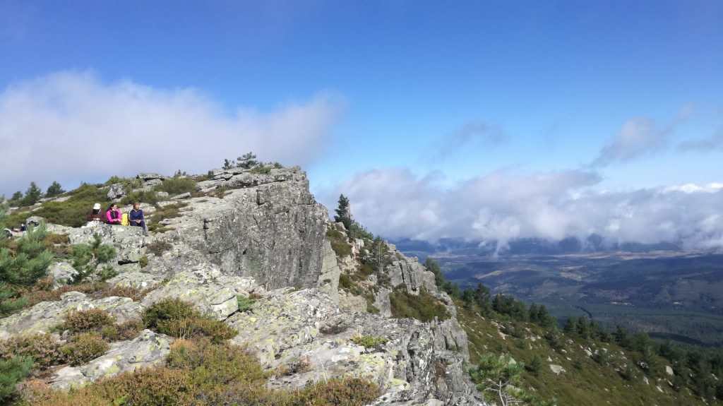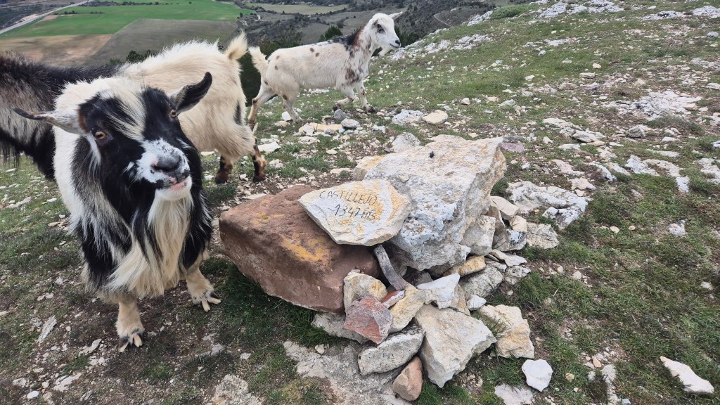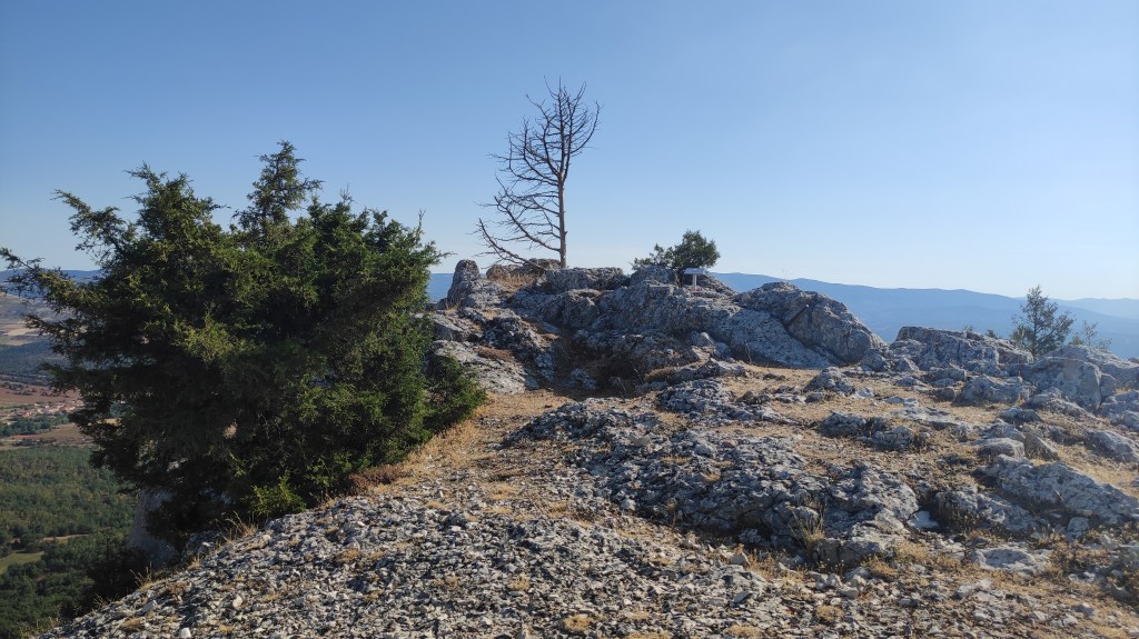 Tras disfrutar, un buen rato, del impresionante paisaje, volvemos a la ermita por la misma vereda. Pasamos por delante de su puerta principal y, por el este, tomando un camino forestal, nos dirigimos al Collado de la Muela. A partir de este punto, no hay camino marcado; sólo unos pocos hitos desperdigados y la vista de la meseta de la muela nos guían hasta su cima. La subida es campo a través, cruzando un bosque de pinos donde tenemos la sensación de caminar sin rumbo. Ya casi arriba, buscamos un estrecho canal que nos ayuda a salvar el pequeño acantilado. Llegados a la meseta, avanzamos por la derecha en dirección a la cresta. Podemos adivinar los restos de la antigua muralla de un castro celtibérico que cubría toda la llanura, y fotografiar un precioso mojón de piedras, cuya utilidad desconocemos, que nos queda a la derecha junto al acantilado. En la cima de la muela, un pequeño refugio de piedras, un vértice geodésico, una cruz de piedras en el suelo y, lo más llamativo de todo, unas vistas aún más deslumbrantes que las del Castillejo, ya que, a las anteriores, se suman, al este, la Sierra de Gayubar y la Sierra de la Demanda con la Campiña como pico más destacado.