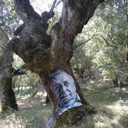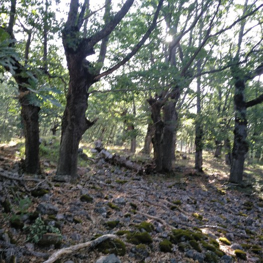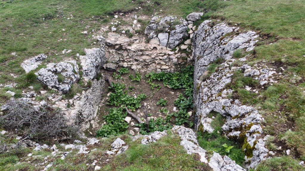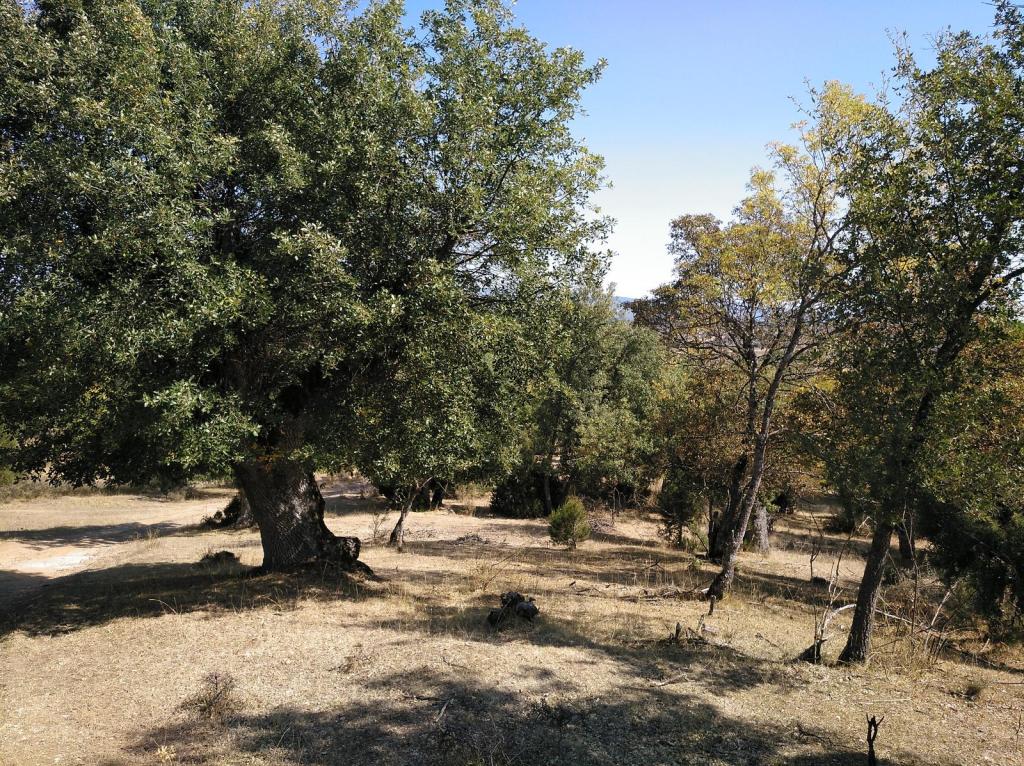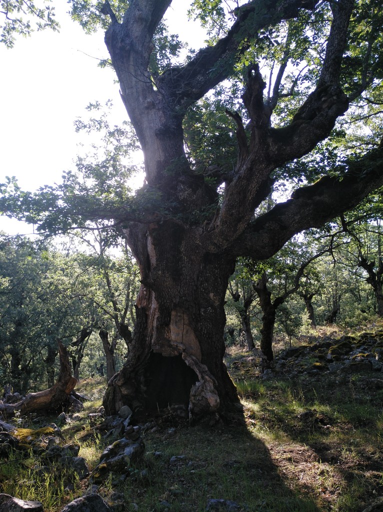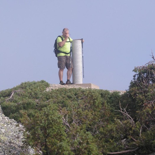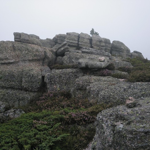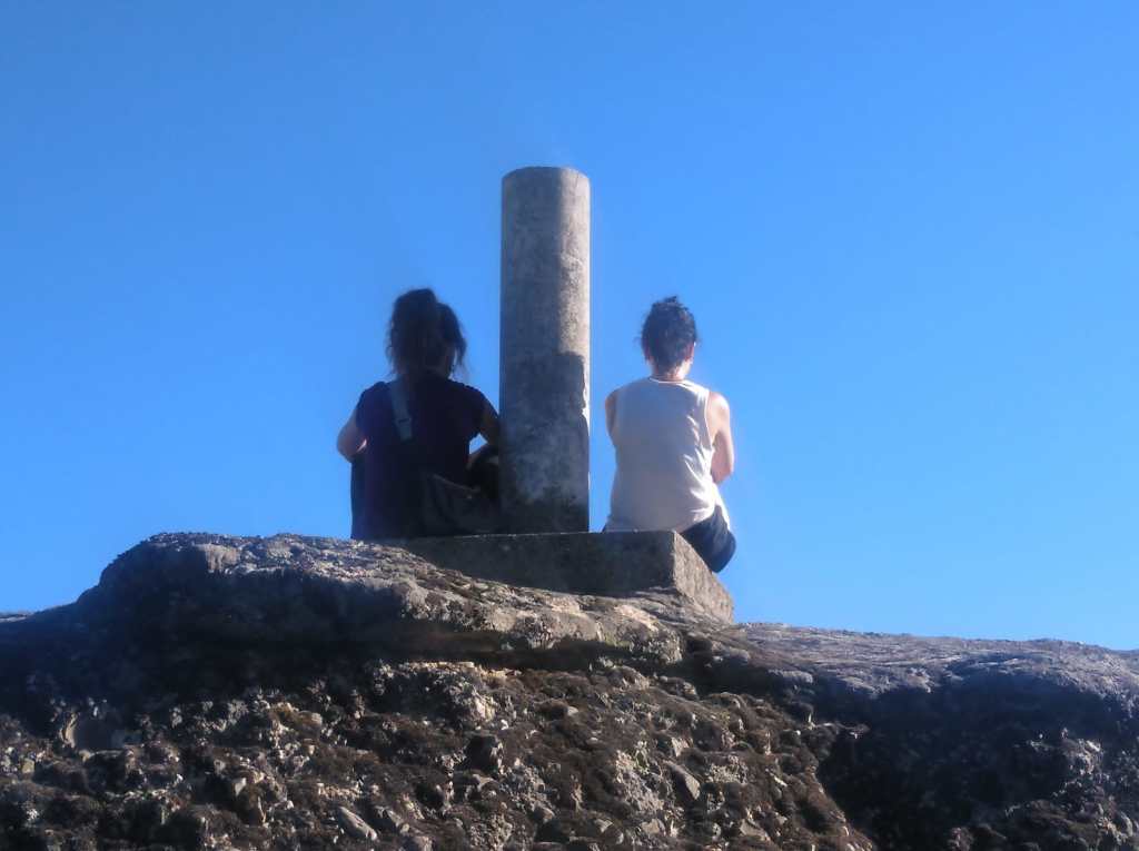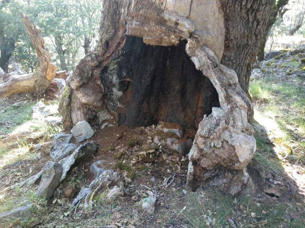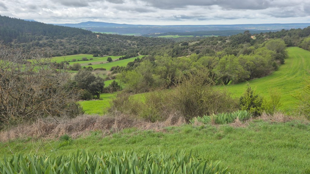 Tras disfrutar, un buen rato, del impresionante paisaje, volvemos a la ermita por la misma vereda. Pasamos por delante de su puerta principal y, por el este, tomando un camino forestal, nos dirigimos al Collado de la Muela. A partir de este punto, no hay camino marcado; sólo unos pocos hitos desperdigados y la vista de la meseta de la muela nos guían hasta su cima. La subida es campo a través, cruzando un bosque de pinos donde tenemos la sensación de caminar sin rumbo. Ya casi arriba, buscamos un estrecho canal que nos ayuda a salvar el pequeño acantilado. Llegados a la meseta, avanzamos por la derecha en dirección a la cresta. Podemos adivinar los restos de la antigua muralla de un castro celtibérico que cubría toda la llanura, y fotografiar un precioso mojón de piedras, cuya utilidad desconocemos, que nos queda a la derecha junto al acantilado. En la cima de la muela, un pequeño refugio de piedras, un vértice geodésico, una cruz de piedras en el suelo y, lo más llamativo de todo, unas vistas aún más deslumbrantes que las del Castillejo, ya que, a las anteriores, se suman, al este, la Sierra de Gayubar y la Sierra de la Demanda con la Campiña como pico más destacado.
