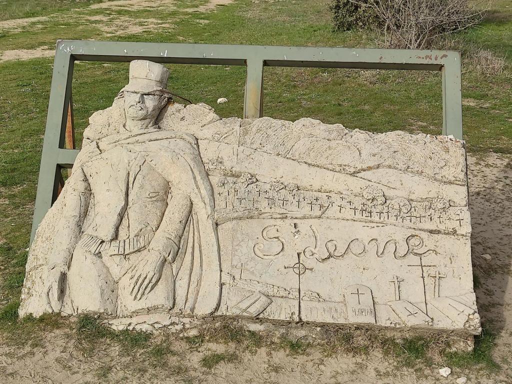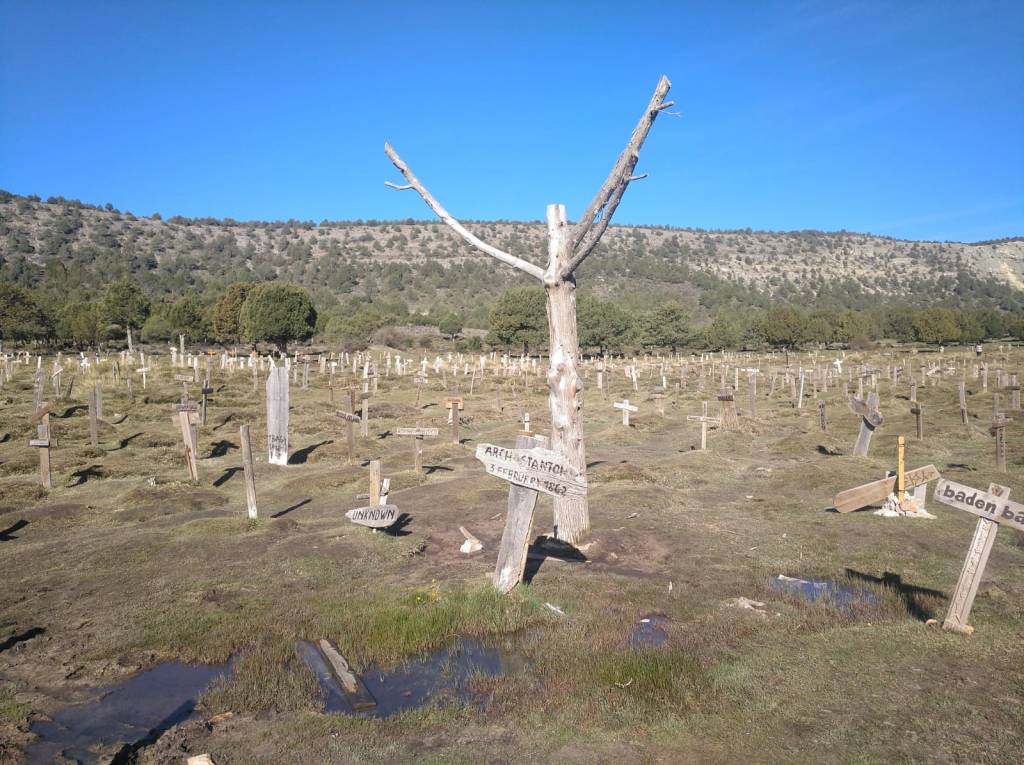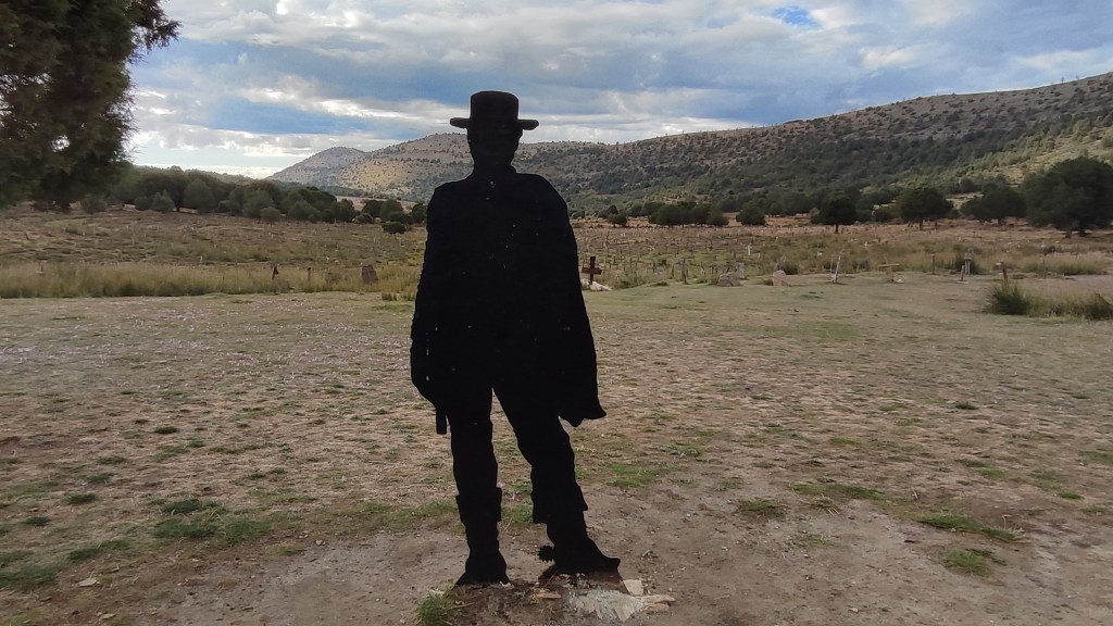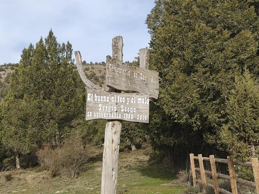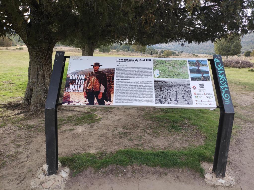 Como mencionábamos más arriba, en este lugar tuvo lugar la escena del «Triello», duelo por dinero a tres bandas entre Rubio (Clint Eastwood), Tuco (Eli Wallach) y Sentencia (Lee Van Cleef). Una poderosa escena con tres rostros que dicen de todo sin hablar, una puesta en escena sobria y bellamente fotografiada por Tonino Delli Colli y una partitura suprema del gran Ennio Morricone. Reproducimos aquí literalmente parte de la información que podemos encontrar en el cartel informativo que preside el cementerio: «El visitante se encuentra frente a uno de las localizaciones cinematográficas más importantes de la historia del séptimo arte… . El set se construyó según el diseño del escenógrafo Carlos Simi en apenas tres días por 250 soldados del ejército español recreando un soberbio cementerio circular con más de 5000 tumbas dispuestas en círculos concéntricos y radios rodeando una plazoleta central empedrada de 30 metros donde se sitúa el clímax. Las imágenes están montadas como en un videoclip al ritmo de la banda sonora de Ennio Morricone que va «in crescendo» hasta la resolución final. Esta escena es una de las más recordadas del género y denota una maestría en el montaje admirable».