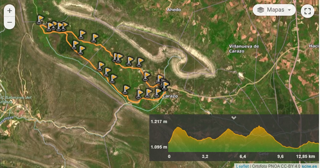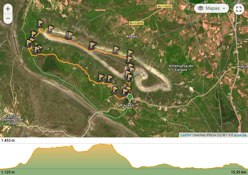 Se trata de una ruta circular que podemos hacer en las dos direcciones. Nosotros optamos por subir primero a Betterville y dejar el tramo menos interesante para el final. Salimos desde la fuente de la Calle Huertas, que está al final del pueblo y, tras cruzar el Puente de la Tejera que cuelga sobre el recién nacido rio Mataviejas, nos vamos a buscar la senda que nos sube hasta la Majada de las Merinas, que es donde está Betterville. Nos entretenemos en recrearnos con la reciente reconstrucción y en imaginar cómo sería el campo completo; leemos curiosas informaciones y anécdotas sobre Betterville, y nos perdemos en las fantásticas vistas de las dos peñas que rodean Carazo: Soncarazo a la derecha, y El Enebral a la izquierda. Con la mirada vigilante de la Peña de Soncarazo primero y de San Carlos después, entre brezos, robles, bellísimos enebros y alguna encina suelta, avanzamos por el GR-82, cerca de los términos de Valdemuerto, donde se rodó la película de El Valle de las Espadas, y de la Cerca hasta llegar al Cementerio de Sad Hill. Después de recorrerlo de arriba a abajo, salimos por la parte de atrás y, tras pasar por un abrevadero, buscamos el camino que nos trajo hasta aquí. Tenemos que desandar medio kilometro y dejarlo un poco más adelante para irnos hacia el pinar que hay a la derecha. Lo atravesamos inmersos en una inmensa paz. Con la hermosa vista de La Copeta a la derecha, bajamos hasta la Dehesa de Carazo, donde nos sorprende la gran cantidad de reses de ganado vacuno que pacen en el entorno. El último tramo, de escaso interés, transcurre por un camino rodado y por la carretera BU-910 durante unos 400 metros. Nos adentramos en el pueblo para pasearlo, hacer una visita a su bonita iglesia y refrescarnos en la fuente que nos vio partir. En resumen, una magnífica ruta que siempre recordarás por su preciosa vegetación y por estar ubicada en un entorno que es una auténtica maravilla de la naturaleza.